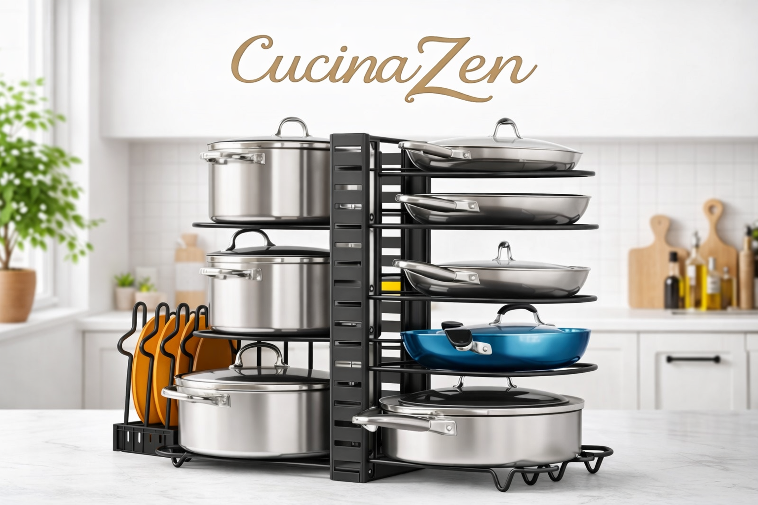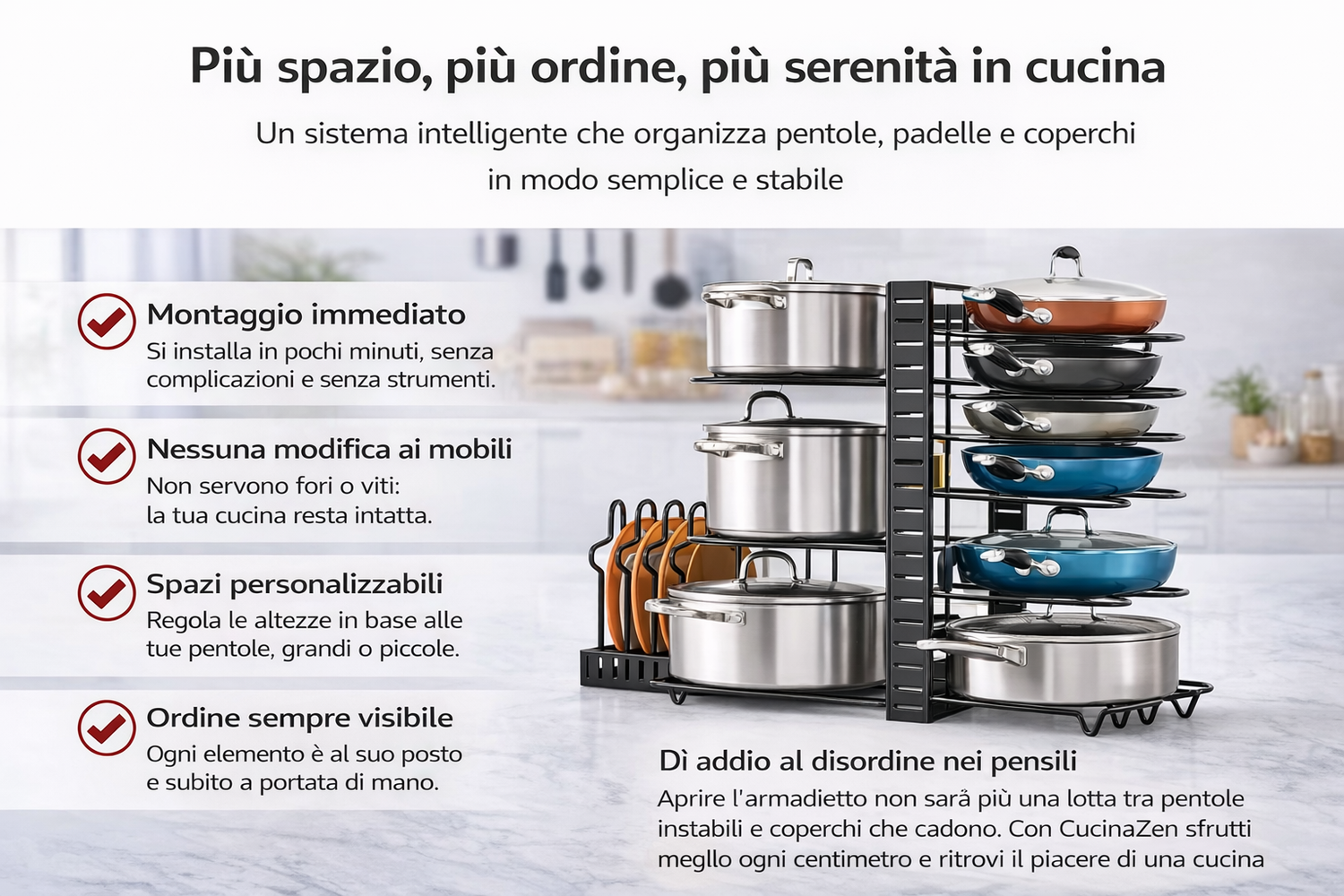 Con CucinaZen organizzi pentole, padelle e coperchi in modo semplice e stabile,
