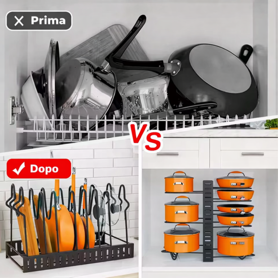 Organizza pentole, padelle e coperchi in pochi secondi, senza stress e senza forare.