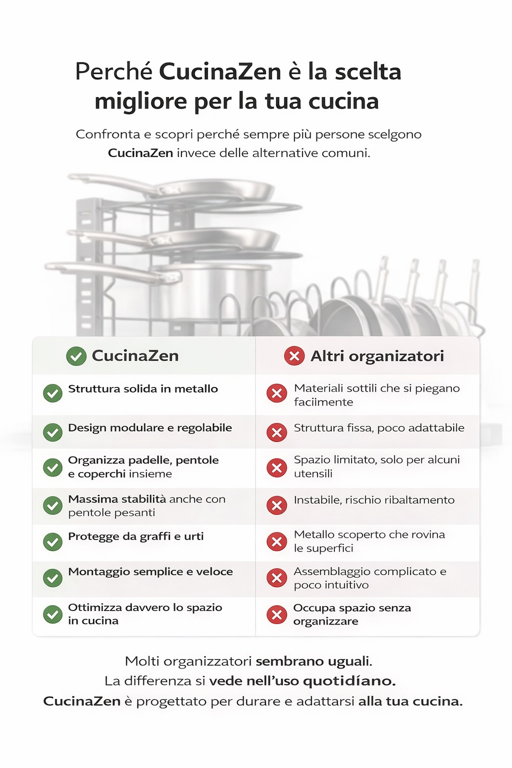 Non siamo qui per venderti un semplice supporto in metallo, ma per offrirti una nuova esperienza in cucina. Scegliere CucinaZen™ significa affidarsi a un brand italiano che mette la qualità e la durata al primo posto. A differenza delle imitazioni economiche in plastica o metallo leggero che si flettono dopo pochi giorni, il nostro acciaio al carbonio è progettato per resistere a carichi pesanti e durare negli anni. Con noi, non acquisti solo ordine, ma la certezza di un'assistenza sempre presente, la comodità del pagamento alla consegna e la garanzia di un prodotto che rispetta le tue padelle tanto quanto le rispetti tu.